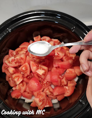 Peel and dice your tomatoes and put them inside your slow cooker. You don't need to dice them too small.